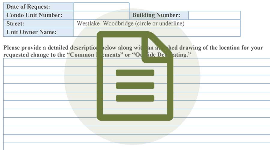 The form allows owners to include a description of the issue and provides an opportunity to offer a solution. Completed forms should be emailed to the Building & Grounds Committee and the Overlook Lakes Office You can also drop off hard copies at the Overlook Lakes Office, 8601 Westlake Dr. A response will be to you within a week.